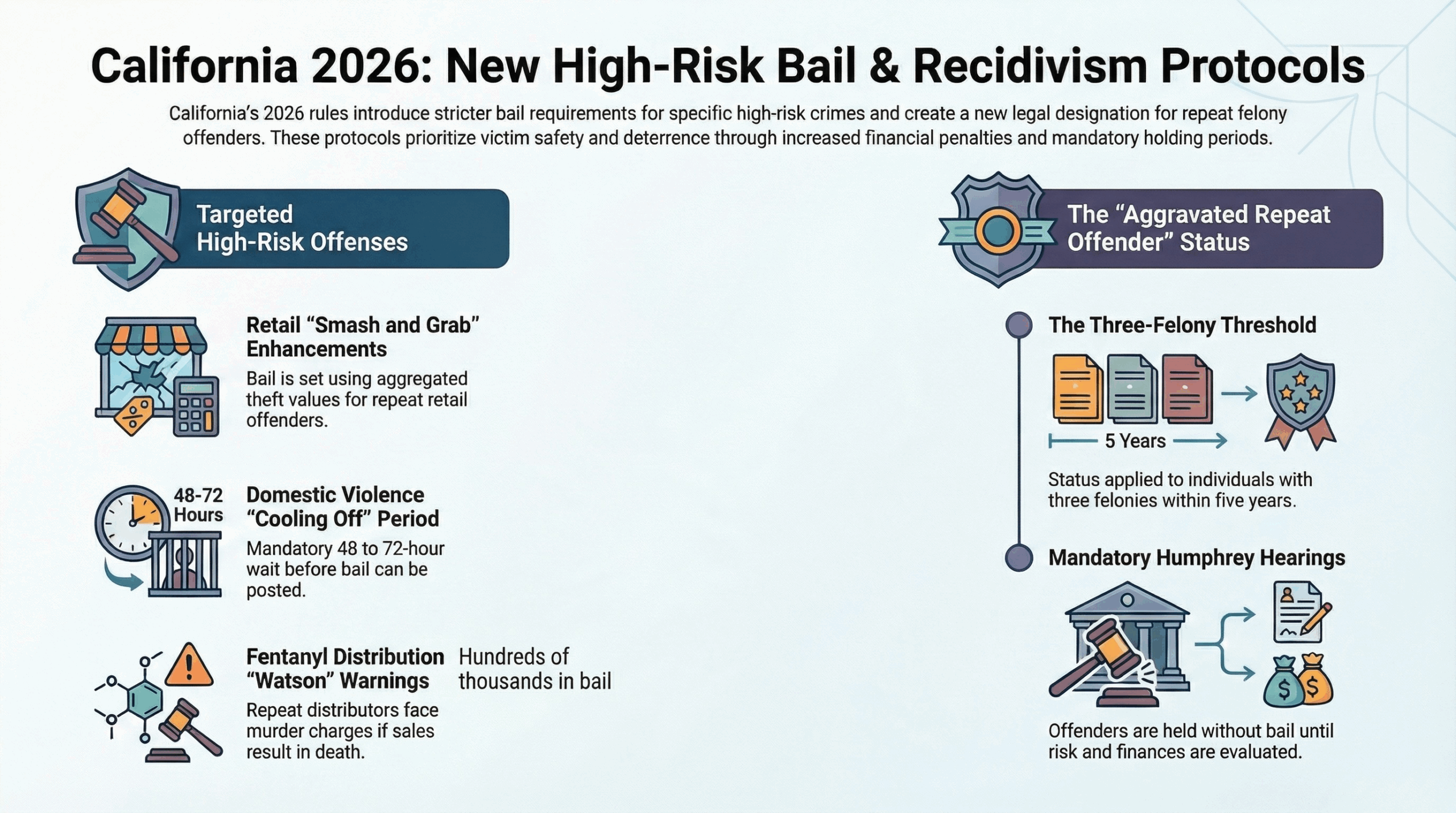 Proposition 36 & The “Three Strikes” Resurgence Proposition 36 has fundamentally changed the landscape. While California’s original “Three Strikes” law was softened in previous years, the 2024 ballot measure (which reached full implementation in 2026) reintroduced stricter penalties for repeat drug and theft offenses. Judges now have more leverage to treat “petty” crimes as felonies if the defendant has two or more prior convictions, directly impacting bail eligibility and amounts.