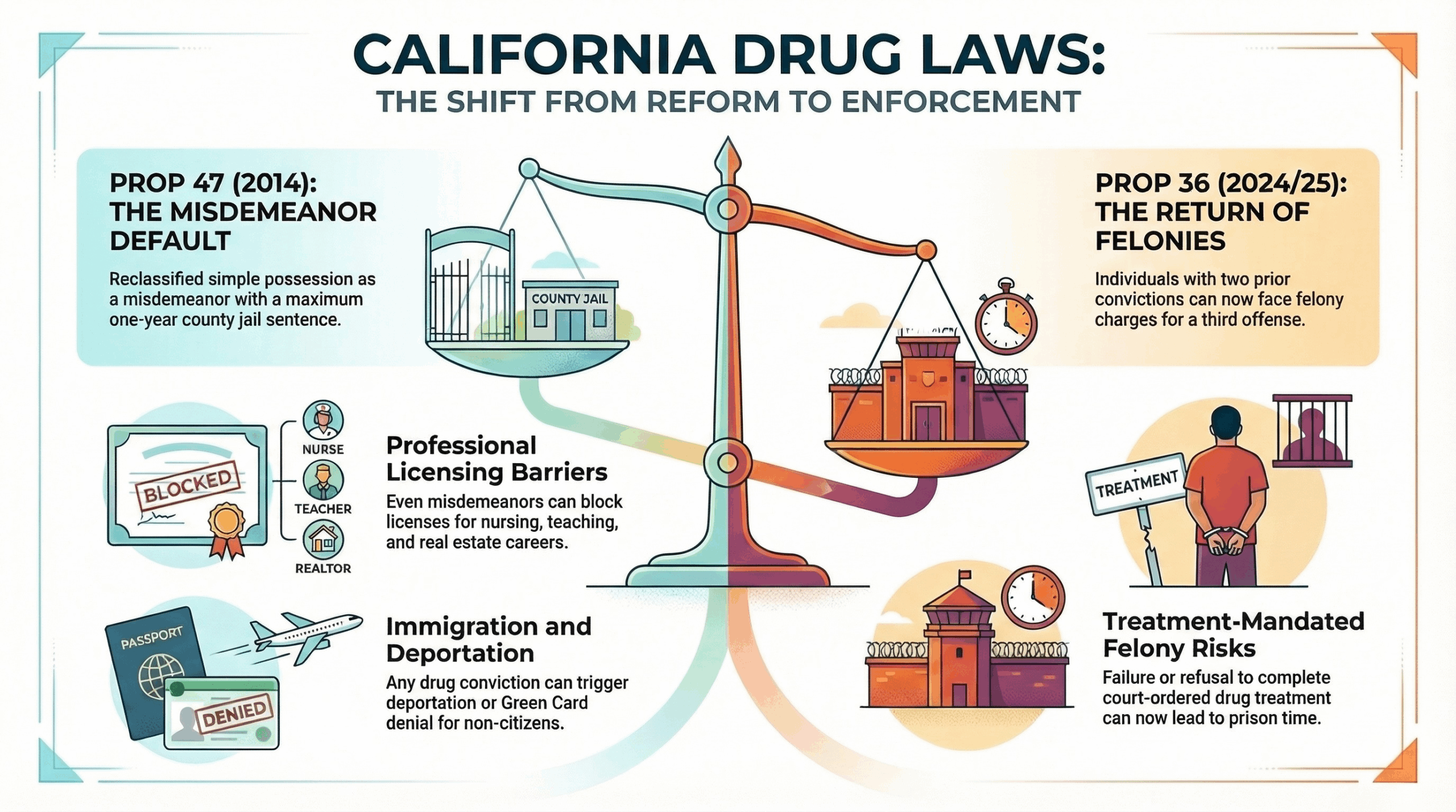 6. Is simple possession always a misdemeanor? Not anymore. Following the 2024 passage of Prop 36, repeat offenders with two or more prior convictions can now face felony charges for simple possession.