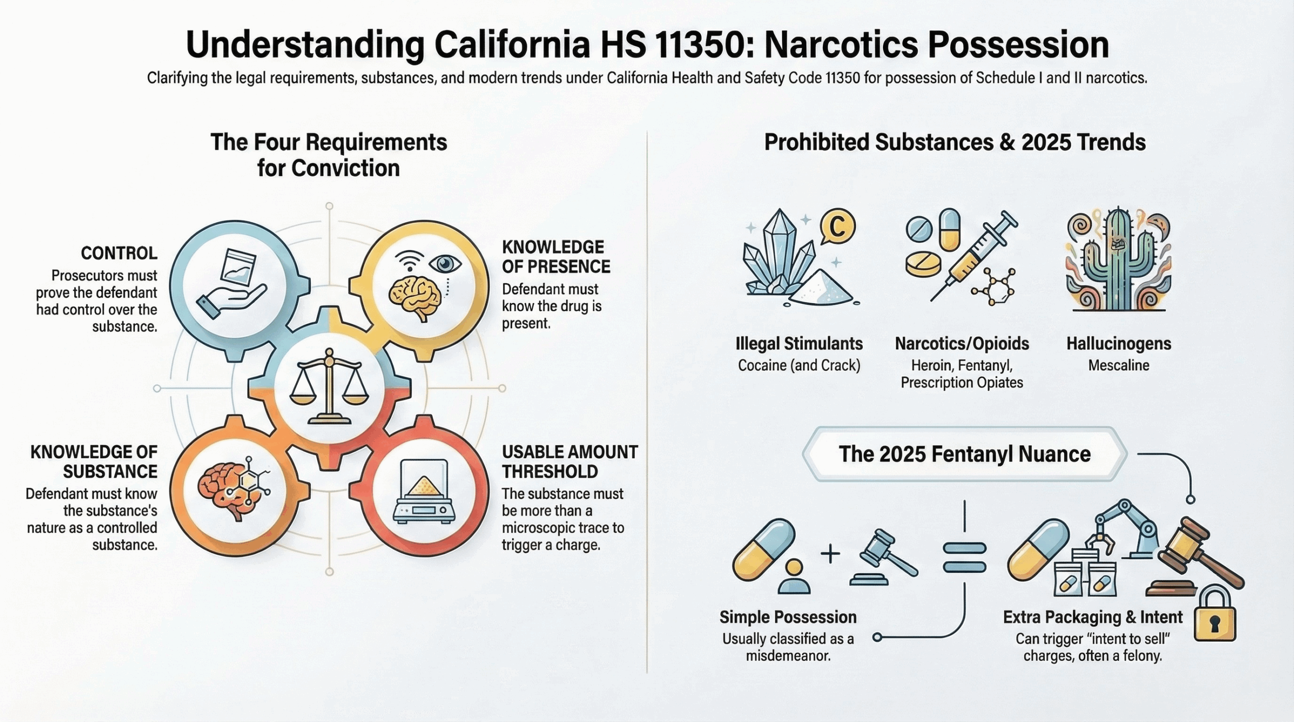 Due to the ongoing opioid crisis, California law enforcement has increased focus on Fentanyl. While simple possession of Fentanyl is still usually a misdemeanor under HS 11350, prosecutors are increasingly looking for ways to charge “possession with intent to sell” if there is even a small scale or extra packaging present. Understanding this nuance is critical for your defense.
