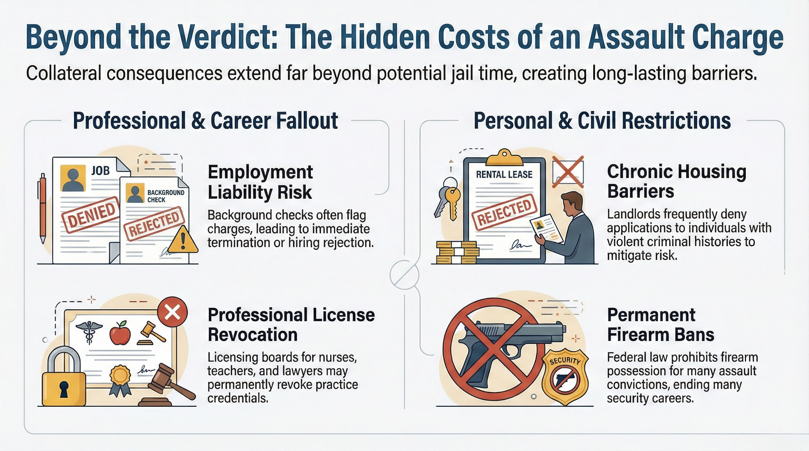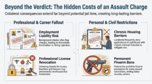 The consequences of an assault charge extend far beyond the courtroom. Even if you aren’t sentenced to jail, the “criminal record” can follow you for decades.