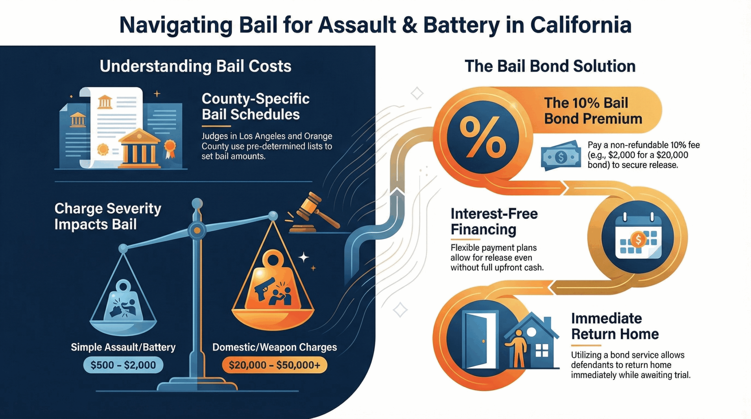 How Bail is Set: Judges in Los Angeles and Orange County use a pre-determined list to set bail. For “Simple Assault” or “Simple Battery,” bail might be relatively low (often between $500 and $2,000). However, if the charges involve a domestic partner or a weapon, bail can skyrocket to $20,000, $50,000, or more.
