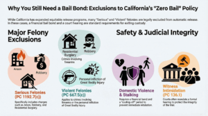 Many people search for “no bail” because they were told they cannot get out for free. While California has moved toward more equitable release programs, many “Serious” and “Violent” felonies are excluded from automatic release. You will likely need a bail bond for: