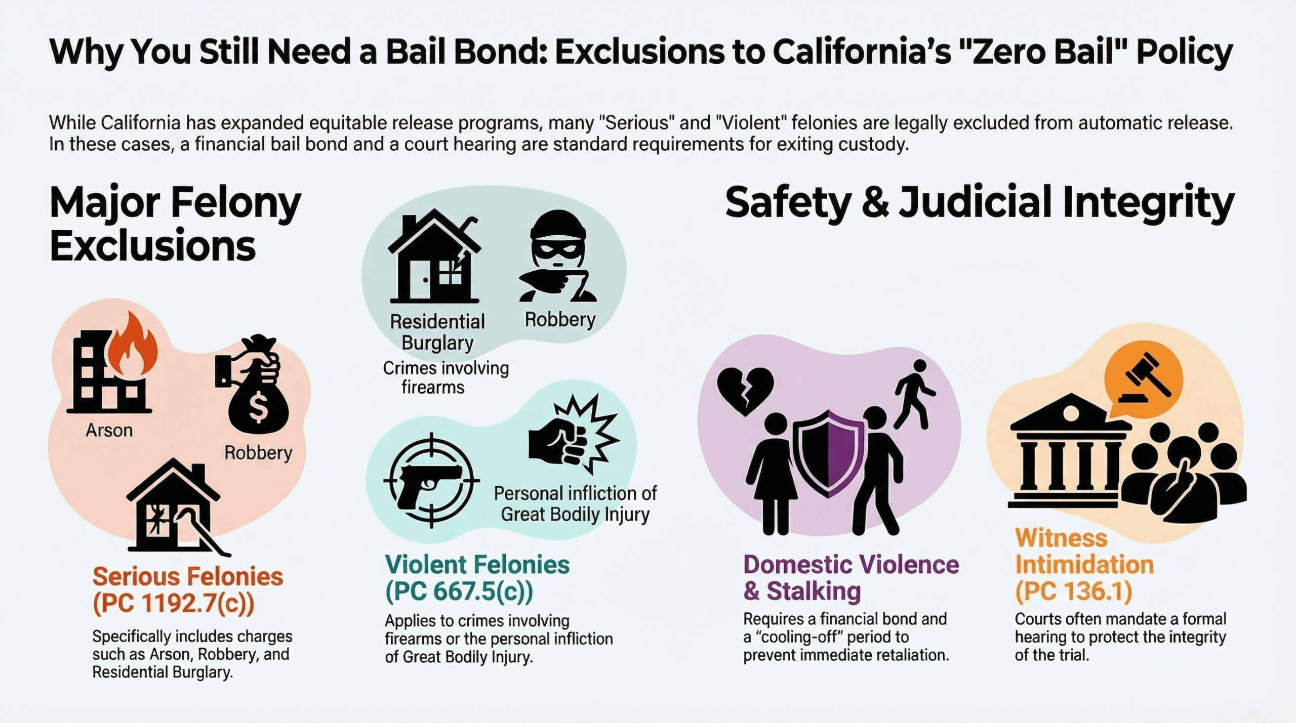 Domestic Violence & Stalking: Because of the high risk of immediate retaliation, Penal Code 273.5 (Corporal Injury on a Spouse) and PC 646.9 (Stalking) almost always require a financial bond and a cooling-off period.